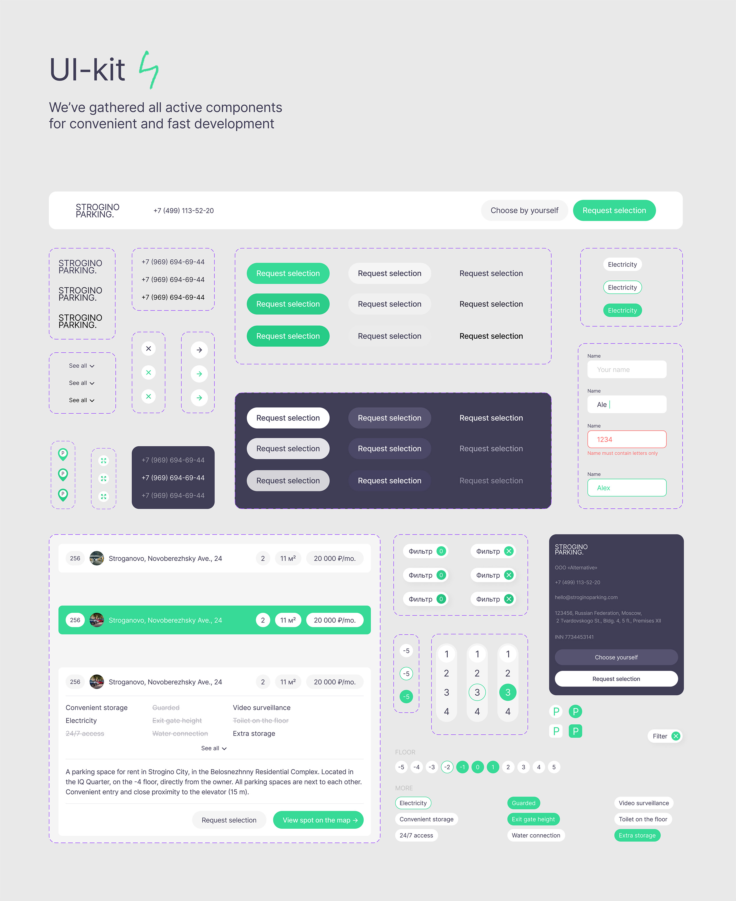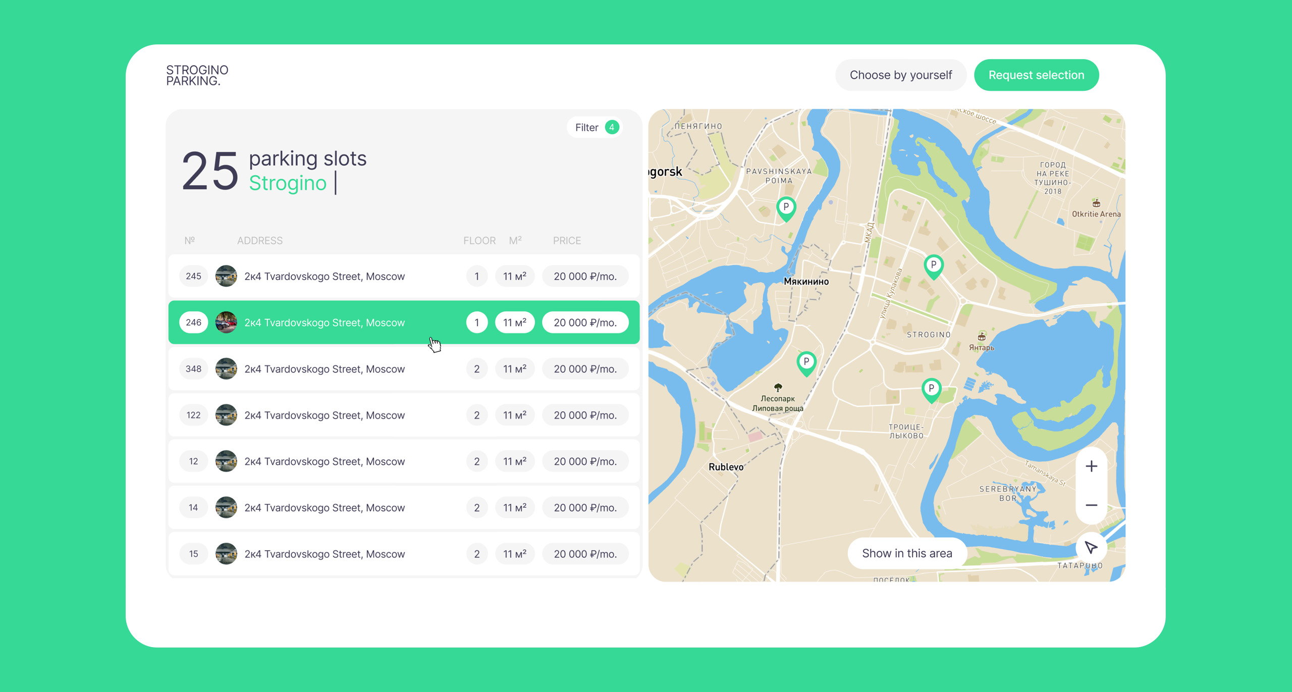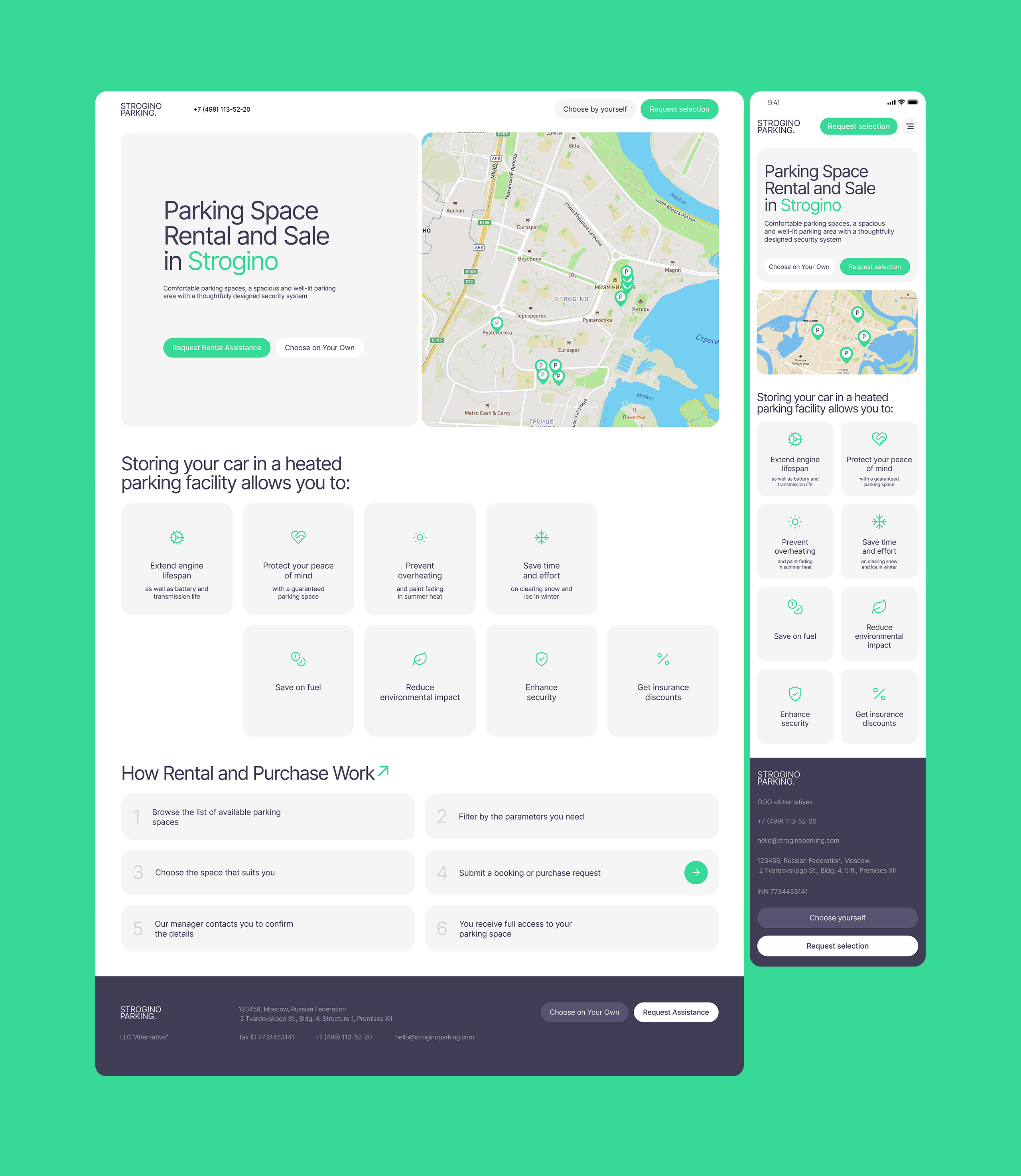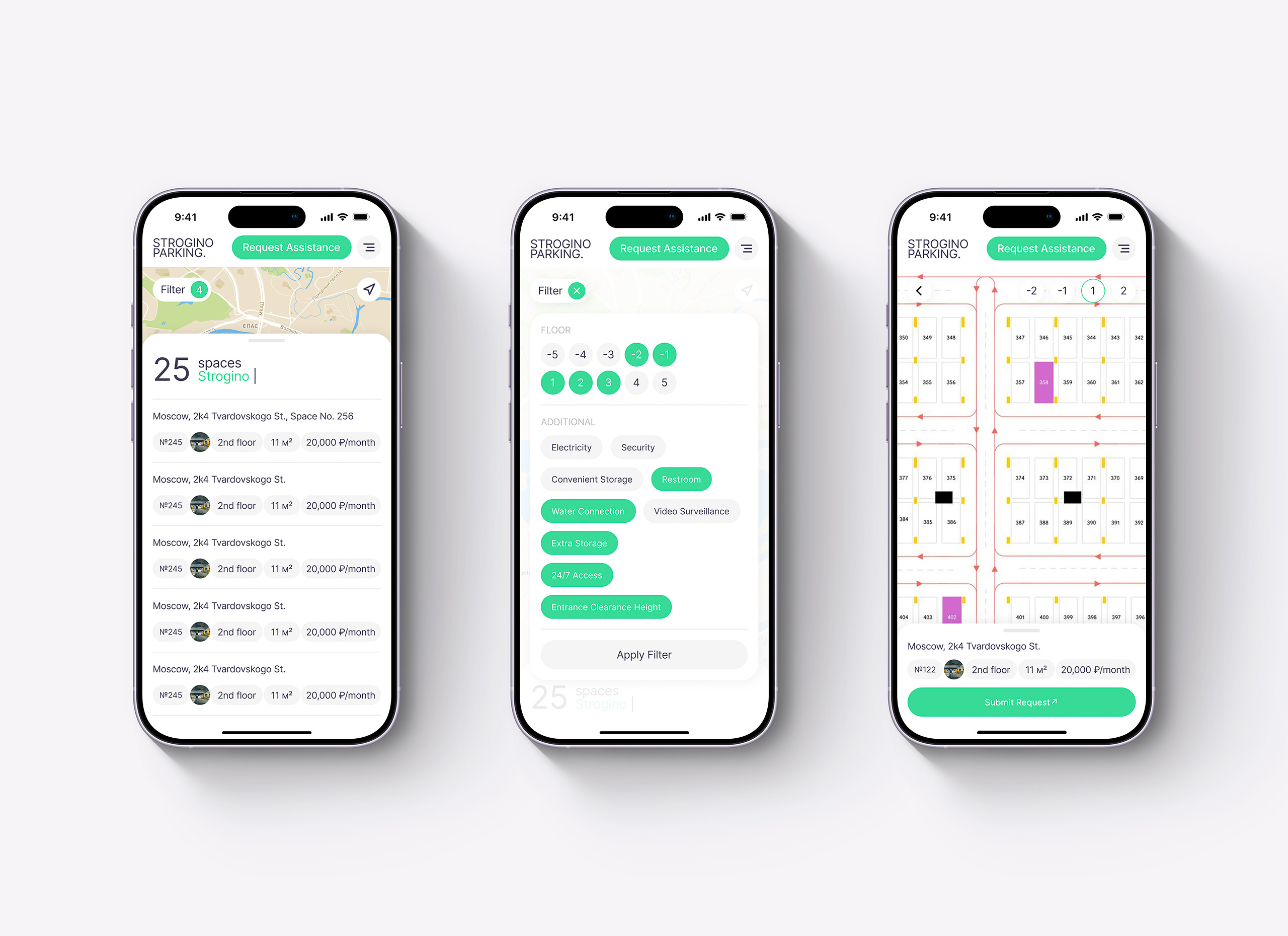 The service was designed around an interactive map and structured parking layouts to make space selection clear and intuitive. Users can filter by parameters, view floor plans, and compare available spots within a single interface. Both desktop and mobile versions were optimized for quick navigation and minimal steps from search to request submission.