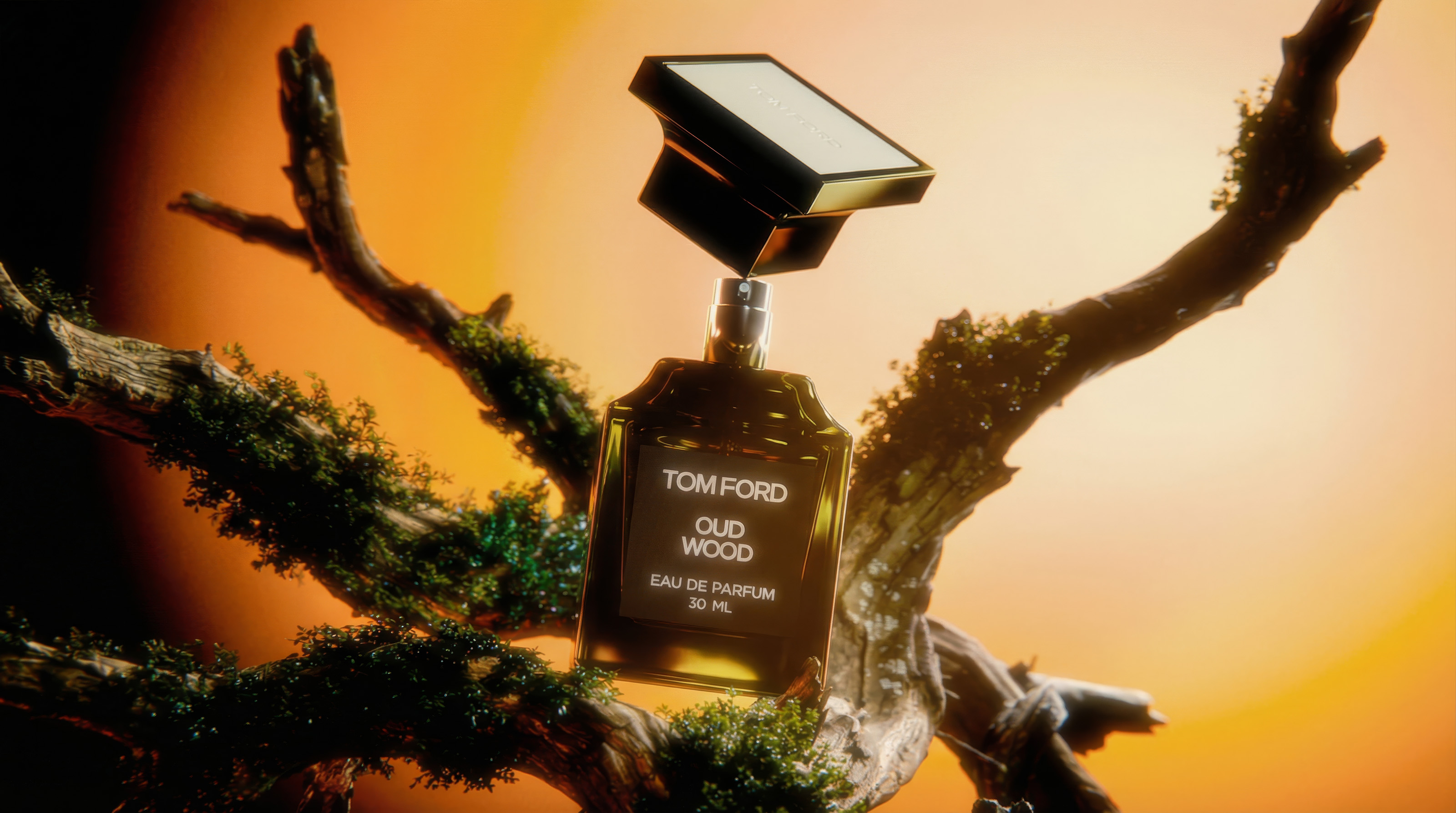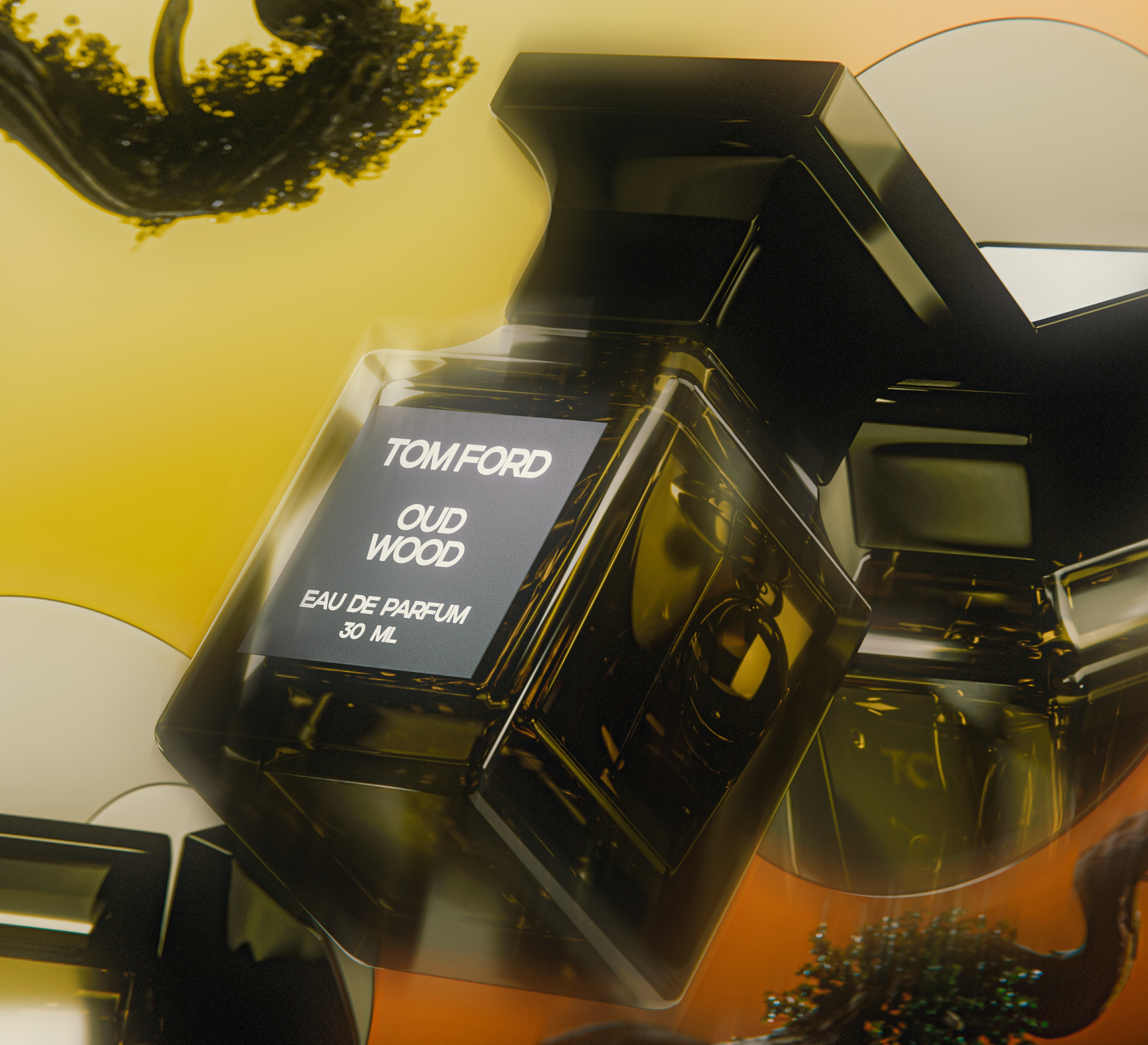 A series of 3D stills inspired by Tom Ford Oud Wood, focusing on product presentation within a controlled, light-driven environment.